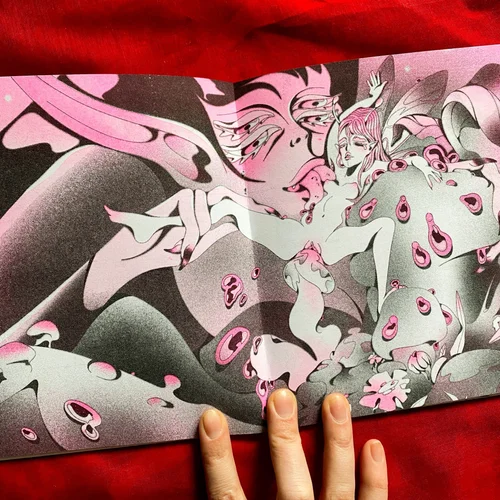 A group anthology featuring 12 artists creating fantasy themed erotic comics and illustrations. This zine is 60 pages of elves, demons, grand faeries, (and much more) living out all kinds of sexy scenarios to create one hefty book. Interior pages are hand-riso printed in black and fluorescent pink with a full color cover. This book is rated R18 (hopefully that’s obvious) Printed in New York (2022)